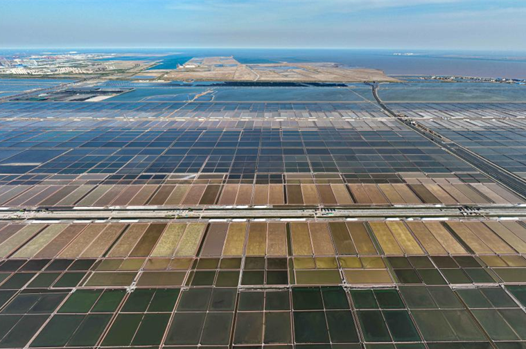 En los últimos días, los trabajadores de Tianjin Changlu Haijing Group Co., Ltd. han estado ocupados cosechando sal en sus 250 000 mu (unas 16 700 hectáreas) de salinas. La cosecha primaveral de sal suele comenzar entre mediados y finales de marzo y junio, dependiendo de las condiciones meteorológicas. (Xinhua/Zhao Zishuo.)
