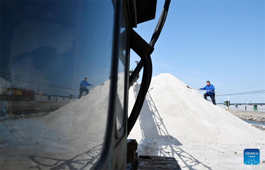 Un trabajador empaqueta la sal cosechada en una salina de Tianjin Changlu Haijing Group Co., Ltd. en Tianjin, norte de China, 27 de abril de 2025. (Xinhua/Zhao Zishuo.)