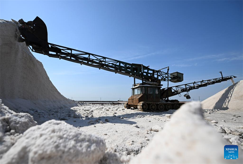 Una máquina transfiere la sal cosechada en una salina de Tianjin Changlu Haijing Group Co., Ltd. en Tianjin, norte de China, el 27 de abril de 2025. (Xinhua/Zhao Zishuo.)