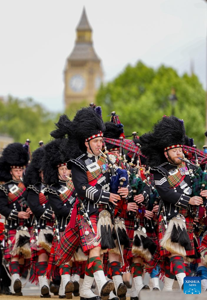 Imagen del 5 de mayo de 2025 de gaiteros participando en la procesión militar, en Londres, Reino Unido. Reino Unido realizó procesiones militares y un sobrevuelo de la Real Fuerza Aérea el lunes para conmemorar el 80 aniversario del Día de la Victoria en Europa. (Xinhua/Wu Lu)