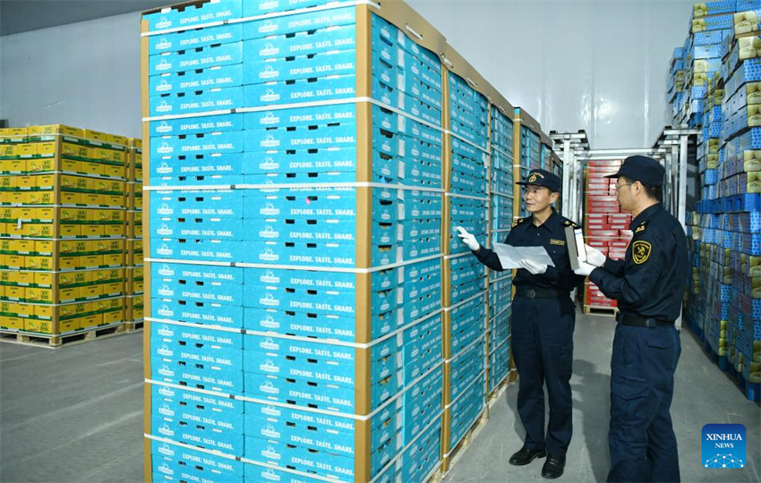 Oficiales de aduanas revisan cajas de peras frescas en Botou, provincia de Hebei, en el norte de China, el 7 de mayo de 2025. (Xinhua/Mu Yu.)