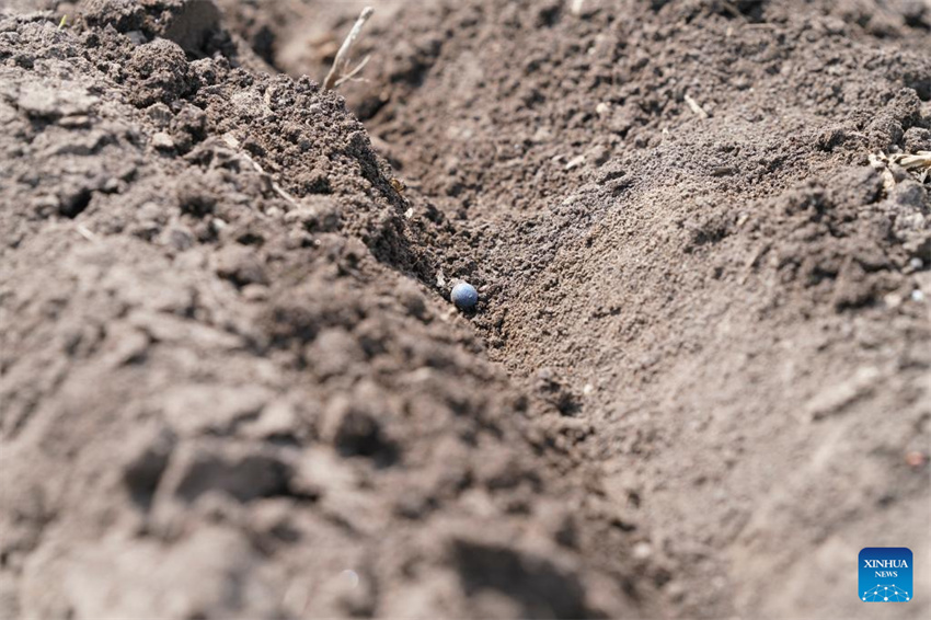 Esta foto tomada el 8 de mayo de 2025 muestra una semilla de soja sembrada en un campo seco de una empresa agrícola del Grupo Beidahuang, en la ciudad de Shuangyashan, provincia nororiental china de Heilongjiang. (Xinhua/Wang Song.)