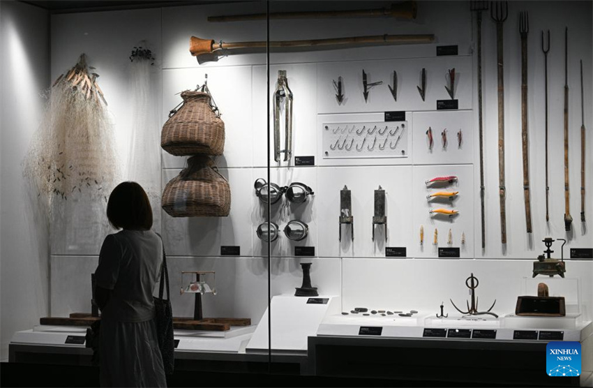 Un visitante observa herramientas de producción del pueblo tanka en el Museo Tanka de Hainan en Lingshui, provincia de Hainan, sur de China, el 13 de mayo de 2025. (Xinhua/Pu Xiaoxu.)