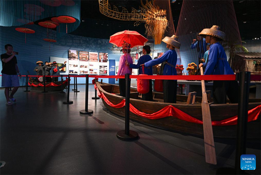 Esta foto tomada el 13 de mayo de 2025 muestra la escena del pueblo tanka celebrando una boda sobre el agua en el Museo Tanka de Hainan, en Lingshui, provincia meridional china de Hainan. (Xinhua/Pu Xiaoxu.)