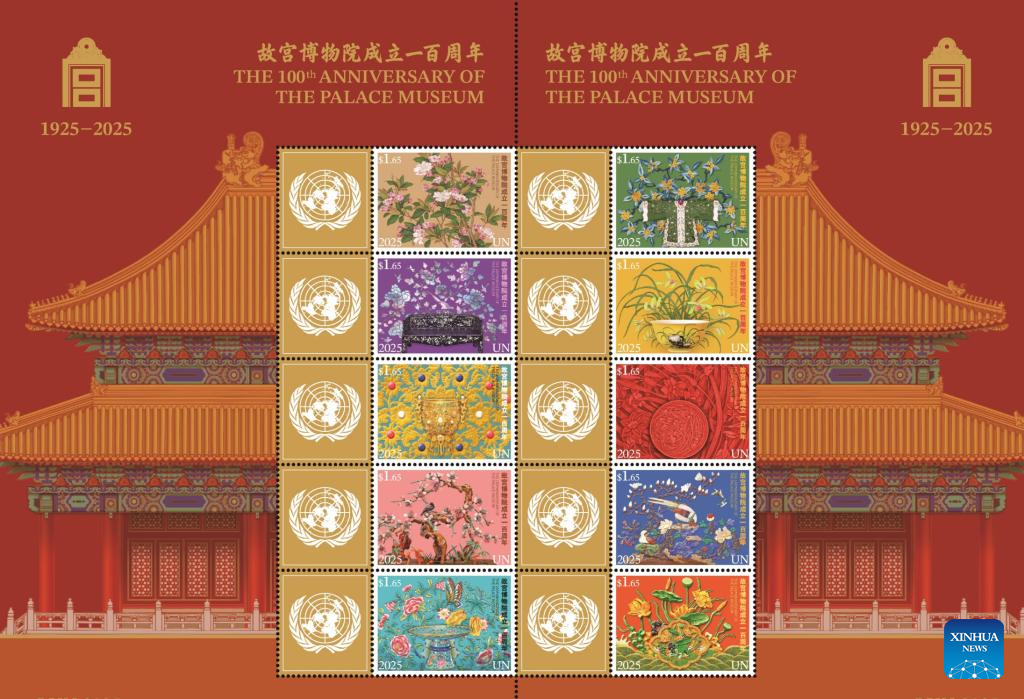 Imagen de una hoja de sellos conmemorativa de la ONU con motivo del centenario del Museo del Palacio. La Ciudad Prohibida, una vez sede de los emperadores chinos, fue homenajeada a nivel mundial el lunes cuando diplomáticos, funcionarios de la ONU y líderes culturales se reunieron en la sede de la ONU para celebrar el centenario del Museo del Palacio. (Xinhua)