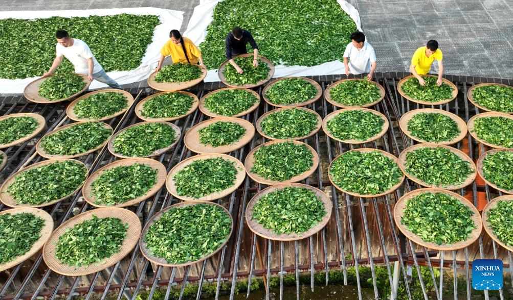 Imagen del 2 de mayo de 2025 de Liu Feng (2-d), un heredero de la técnica de elaboración del té de roca Wuyi, aireando hojas de té con agricultores, en Wuyishan, en la provincia de Fujian, en el sureste de China. Wuyishan, una importante base productora de té en China, es el hogar del famoso té de roca Wuyi, un tipo de té oolong. Su técnica de elaboración del té fue declarada patrimonio cultural inmaterial nacional en 2006 y forma parte de las "técnicas tradicionales de elaboración del té y prácticas sociales asociadas en China" inscritas en 2022 como patrimonio cultural inmaterial de la UNESCO. (Xinhua/Qiu Ruquan)