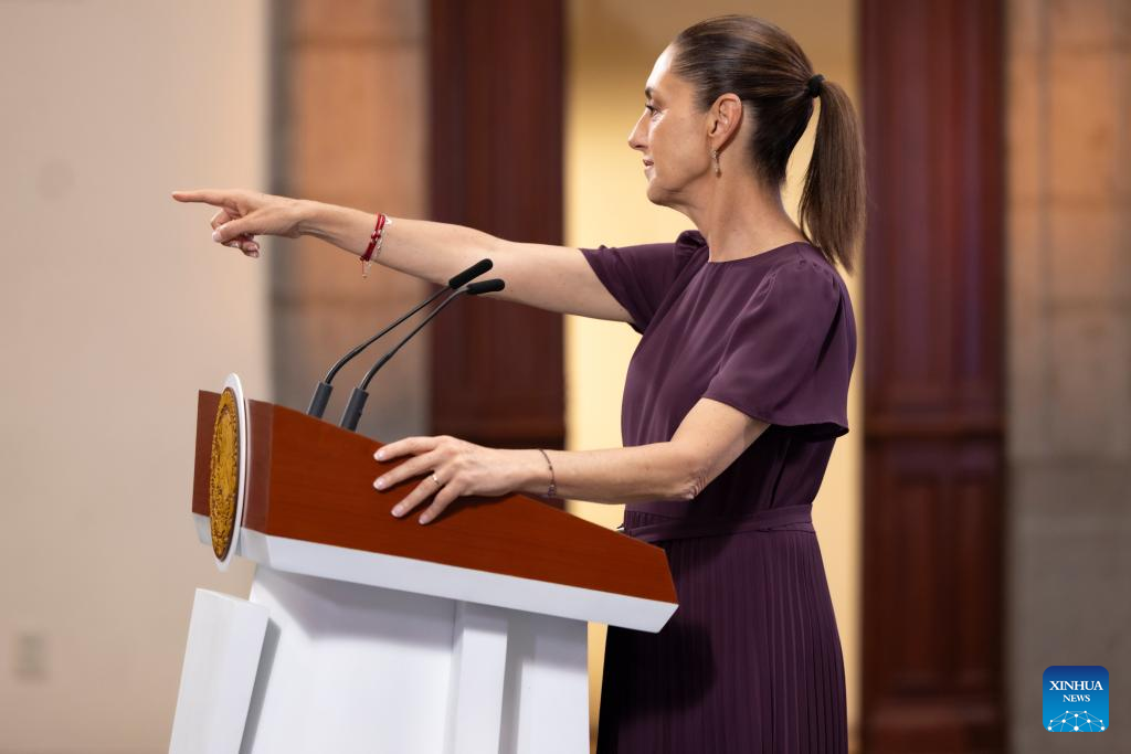 Imagen cedida por la Presidencia de México de la presidenta mexicana, Claudia Sheinbaum, reaccionando durante su conferencia de prensa matutina, en Palacio Nacional, en la Ciudad de México, capital de México, el 22 de mayo de 2025. Sheinbaum informó el jueves que sostuvo una llamada telefónica con su homólogo estadounidense, Donald Trump, y afirmó que se seguirá con la negociación del tema arancelario para asegurar mejores beneficios en los sectores de acero, aluminio y automotriz. (Xinhua/Presidencia de México)