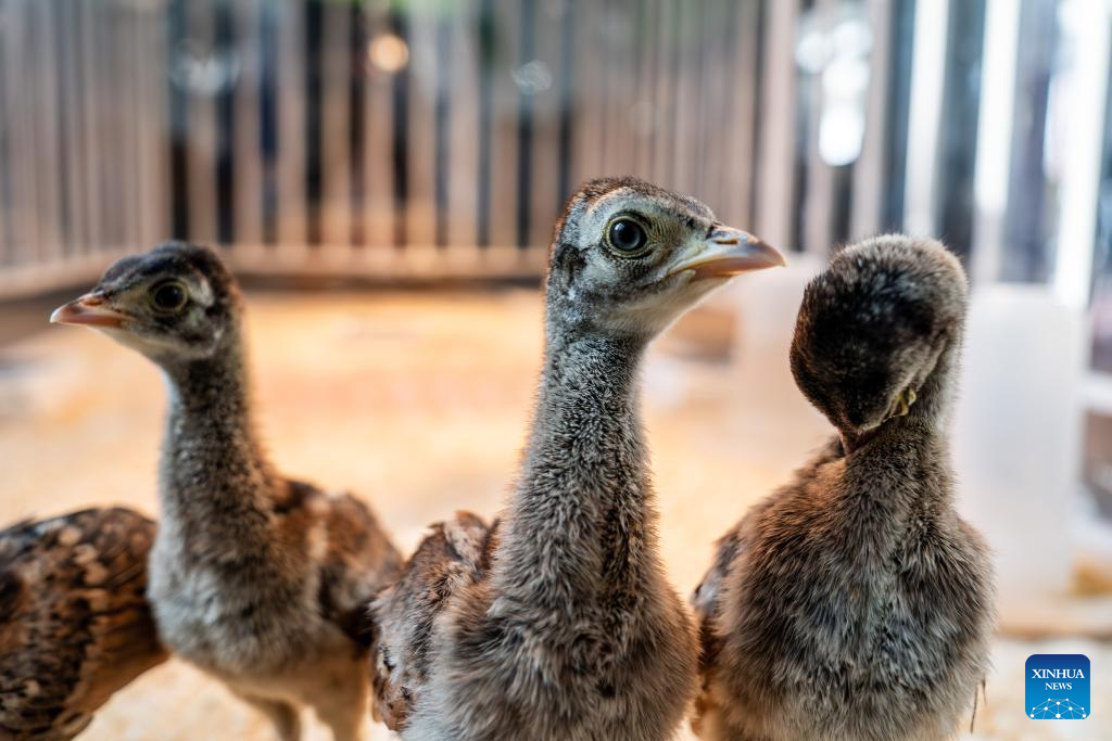 Polluelos de pavo real en el Centro Natural Forestal de Yunnan, en Kunming, provincia suroccidental china de Yunnan, el 19 de mayo de 2025. (Xinhua/Hu Chao.).