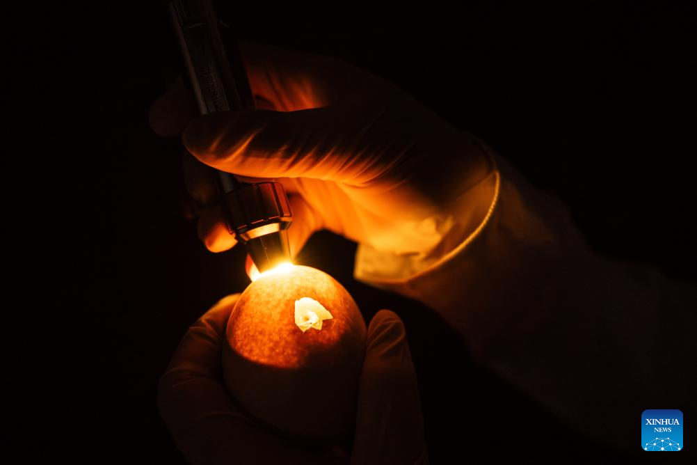 Un miembro del personal del Centro de Naturaleza Forestal de Yunnan comprueba el estado de un polluelo de pavo real verde, que está a punto de salir del cascarón, en Kunming, provincia suroccidental china de Yunnan, el 19 de mayo de 2025. (Xinhua/Hu Chao.)