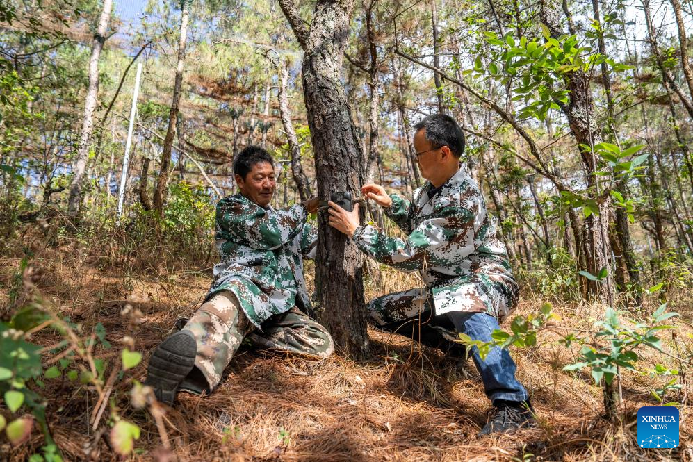Miembros del personal colocan una cámara de infrarrojos en la reserva natural provincial de pavos reales verdes Weishan Qinghua, en la prefectura autónoma de la etnia bai de Dali, provincia suroccidental china de Yunnan, el 20 de mayo de 2025. (Xinhua/Hu Chao.)