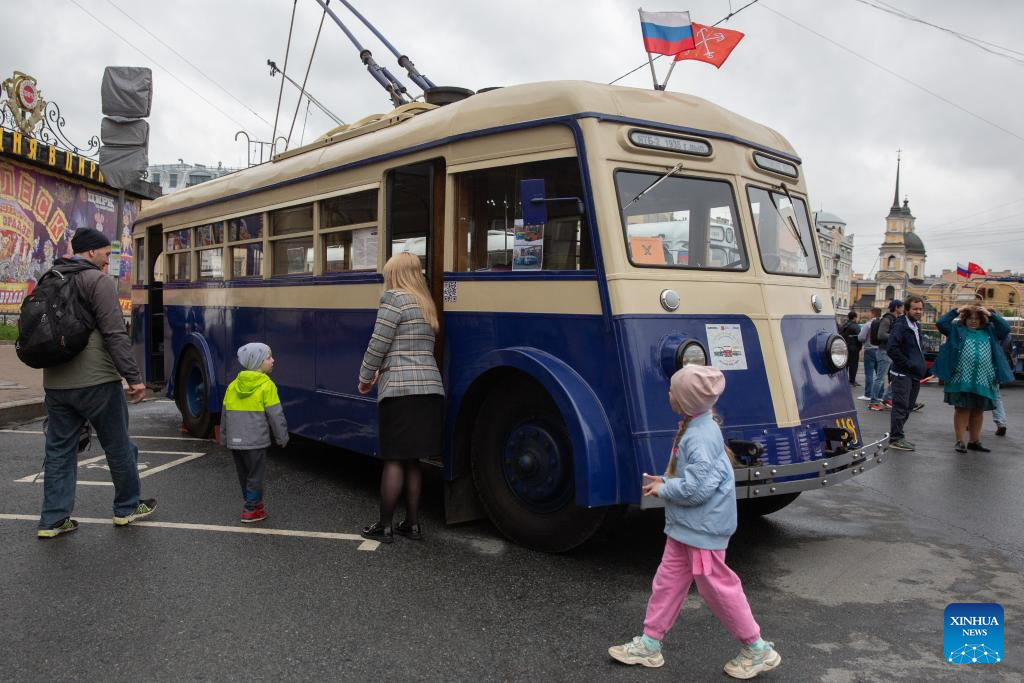 Imagen del 24 de mayo de 2025 de un autobús antiguo exhibido, en San Petersburgo, Rusia. Una exposición de vehículos antiguos se llevó a cabo el sábado como parte de las celebraciones del próximo 322° aniversario de la fundación de Rusia el 27 de mayo. (Xinhua/Irina Motina)