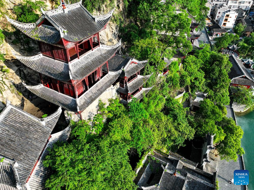 Una foto aérea tomada por un dron el 20 de mayo de 2025 muestra una vista del Complejo de Cuevas de Qinglong construido en el acantilado de la antigua ciudad de Zhenyuan, en la prefectura autónoma de las etnias miao y dong de Qiandongnan, provincia suroccidental china de Guizhou. (Xinhua/Ou Dongqu.)