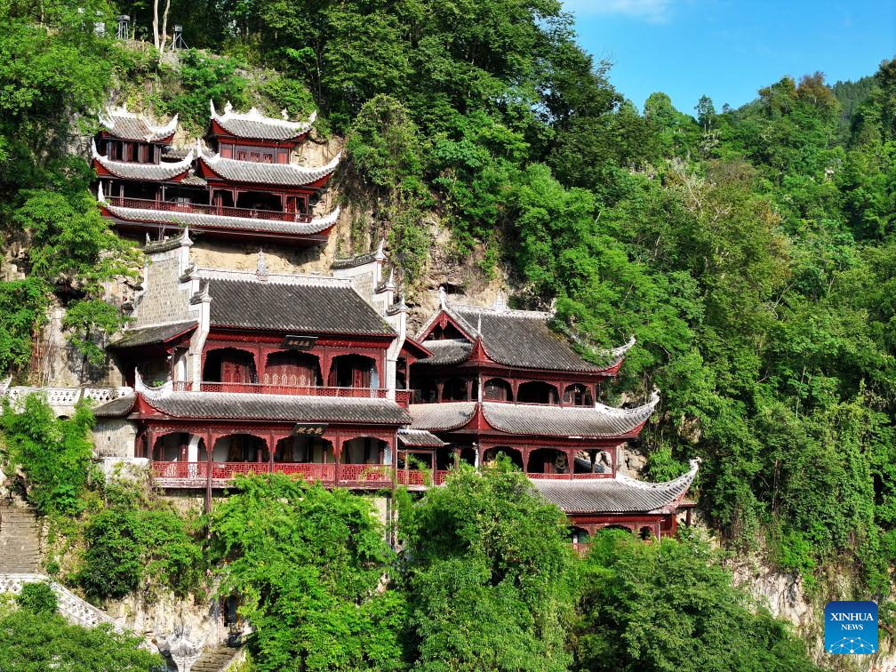 Una foto aérea tomada por un dron el 20 de mayo de 2025 muestra una vista del complejo de cuevas de Qinglong, construido en el acantilado de la antigua ciudad de Zhenyuan, en la prefectura autónoma de las etnias miao y dong de Qiandongnan, provincia suroccidental china de Guizhou. (Xinhua/Ou Dongqu.)