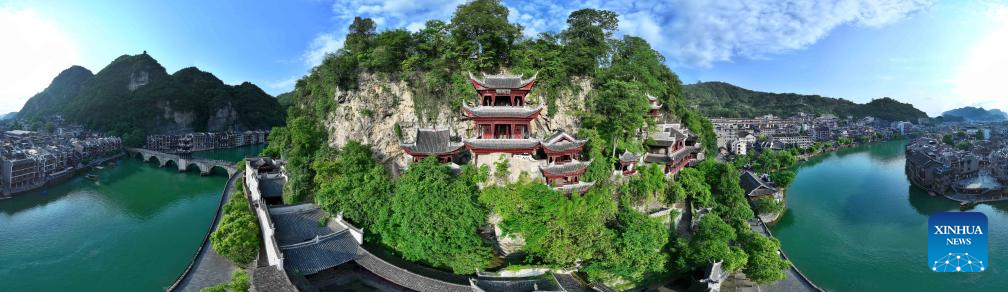 Una foto aérea tomada por un dron el 20 de mayo de 2025 muestra una vista panorámica del Complejo de Cuevas de Qinglong, construido en el acantilado de la antigua ciudad de Zhenyuan, en la prefectura autónoma de las etnias miao y dong de Qiandongnan, provincia suroccidental china de Guizhou. (Xinhua/Ou Dongqu.)