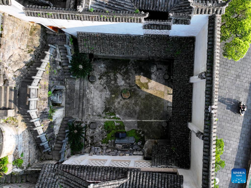 Una foto aérea tomada por un dron el 20 de mayo de 2025 muestra una vista del Complejo de Cuevas de Qinglong, construido en el acantilado de la antigua ciudad de Zhenyuan, en la prefectura autónoma de las etnias miao y dong de Qiandongnan, provincia suroccidental china de Guizhou. (Xinhua/Ou Dongqu.)