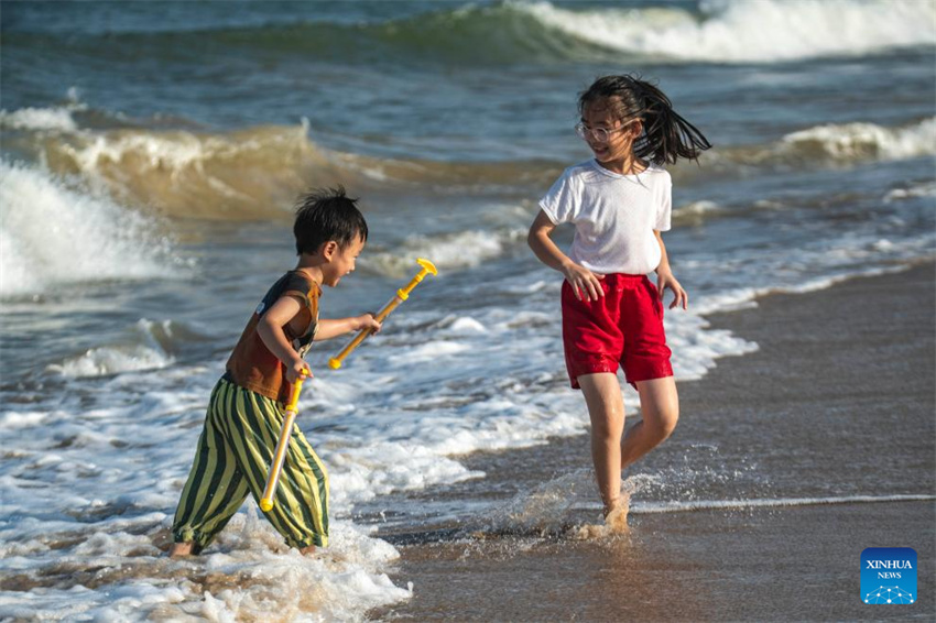 Niños juegan a la orilla del mar en Boao, ciudad de Qionghai, provincia de Hainan, en el sur de China, el 2 de junio de 2025. (Foto de Meng Zhongde/Xinhua.)