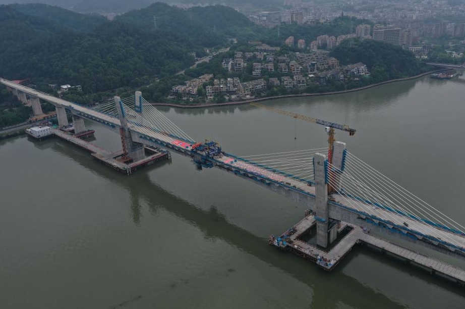 Una foto aérea tomada por un dron el 4 de junio de 2025 muestra el gran puente sobre el río Xin'an en Jiande, provincia oriental china de Zhejiang, el 4 de junio de 2025. Como parte de la línea ferroviaria de alta velocidad Jinhua-Jiande en Zhejiang, el gran puente sobre el río Xin'an finalizó su cierre el miércoles. (Xinhua/Huang Zongzhi.)