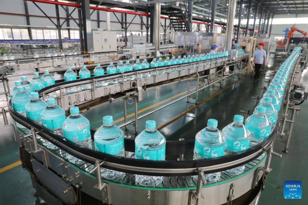 Imagen del 7 de junio de 2025 de empleados trabajando en la línea de producción de agua potable embotellada en Jiangsu Fenghai New Energy Seawater Desalination Development Co., Ltd., en Yancheng, en la provincia de Jiangsu, en el este de China. La ciudad de Yancheng ha intensificado sus esfuerzos para desarrollar industrias marinas y promover tecnologías de desalinización de agua de mar, convirtiéndose en un nuevo polo de crecimiento de desarrollo de alta calidad. (Xinhua/Mao Jun)