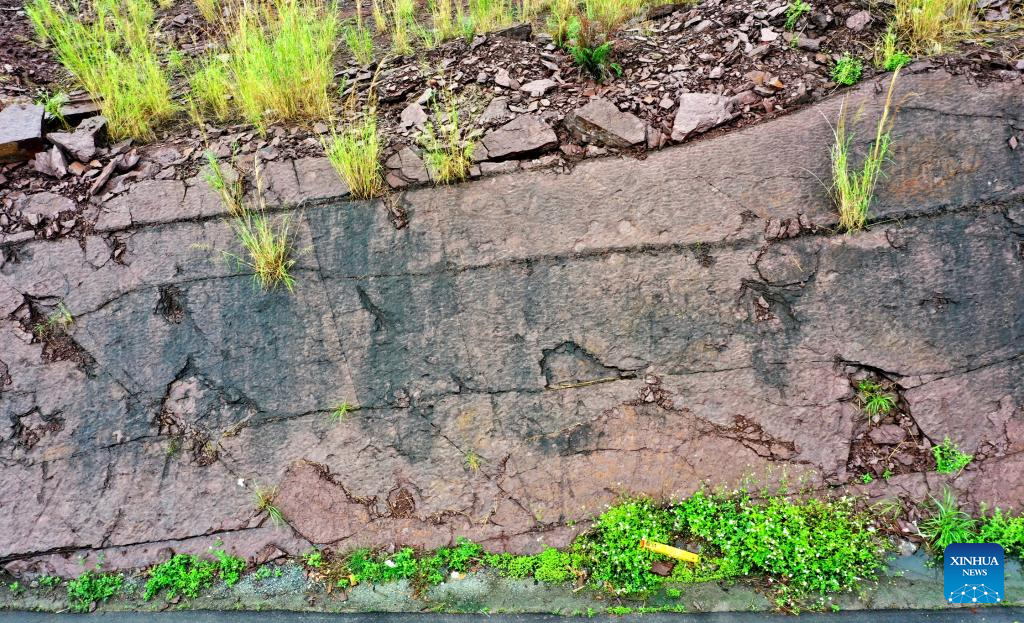 Imagen del 27 de abril de 2025 de las huellas descubiertas en el distrito de Huaiji, en la ciudad de Zhaoqing, en la provincia de Guangdong, en el sur de China. Un equipo de investigación de la Universidad de Geociencias de China (Beijing) anunció el jueves que ha registrado, por primera vez, una combinación de huellas de mamaliaforme y dinosaurio en estratos del Cretácico en el distrito de Huaiji, en la ciudad de Zhaoqing de la provincia de Guangdong, en el sur de China. La huella de mamaliaforme recién descubierta mide tan solo 1,8 centímetros de longitud, según el equipo de investigación. (Xinhua/Liang Xuanrui)