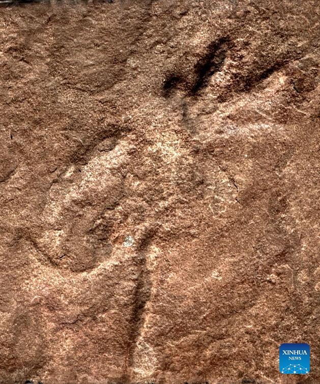Imagen del 19 de febrero de 2025 de las huellas de mamaliaforme de estratos del Cretácico (d-arriba), descubiertas en el distrito de Huaiji, en la ciudad de Zhaoqing de la provincia de Guangdong, en el sur de China. Un equipo de investigación de la Universidad de Geociencias de China (Beijing) anunció el jueves que ha registrado, por primera vez, una combinación de huellas de mamaliaforme y dinosaurio en estratos del Cretácico en el distrito de Huaiji, en la ciudad de Zhaoqing de la provincia de Guangdong, en el sur de China. La huella de mamaliaforme recién descubierta mide tan solo 1,8 centímetros de longitud, según el equipo de investigación. (Xinhua/Mi Jialin)
