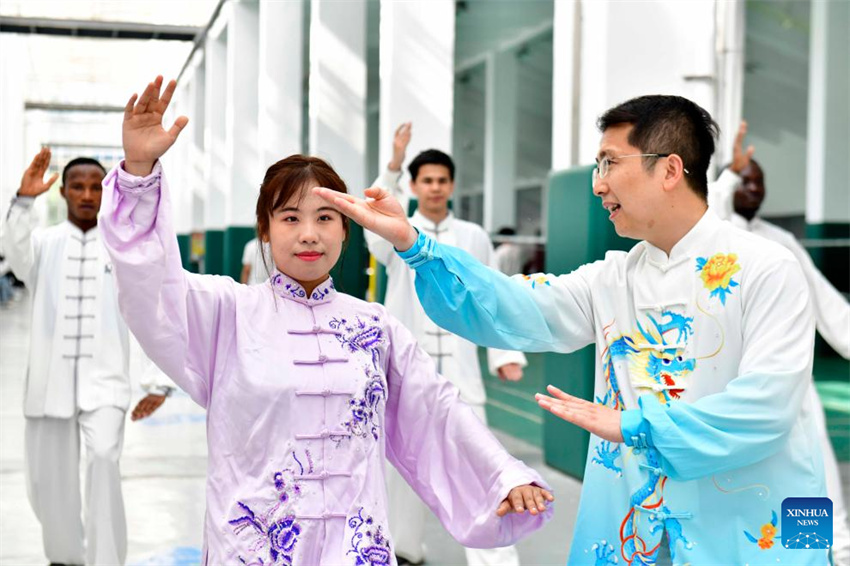 Zeela Nebulani (izquierda, delante) practica taichí siguiendo las instrucciones de un profesor en la Politécnica de Rizhao, en la ciudad de Rizhao, provincia oriental china de Shandong, el 23 de mayo de 2025. (Xinhua/Guo Xulei.)