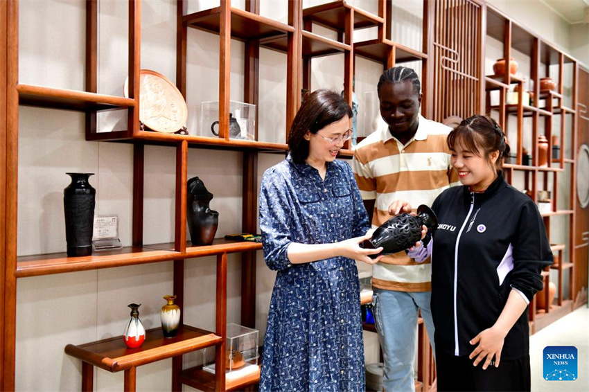 Zeela Nebulani (dcha.) aprende sobre la cultura de la cerámica en la Politécnica de Rizhao, en la ciudad de Rizhao, provincia oriental china de Shandong, el 23 de mayo de 2025. (Xinhua/Guo Xulei.)