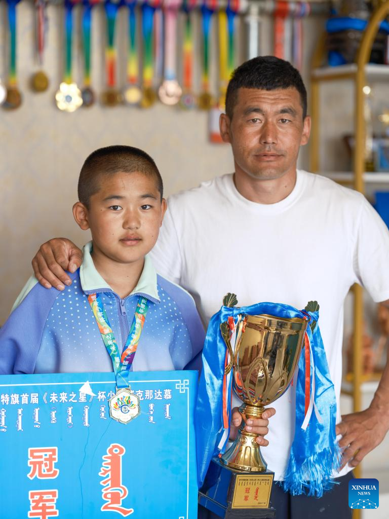 Urbuusan y su hijo Degjiin muestran sus premios de lucha mongola en la Bandera Occidental de Ujimqin, Liga Xilingol, región autónoma de Mongolia Interior, en el norte de China, el 12 de junio de 2025. (Xinhua/Ma Jinrui.)