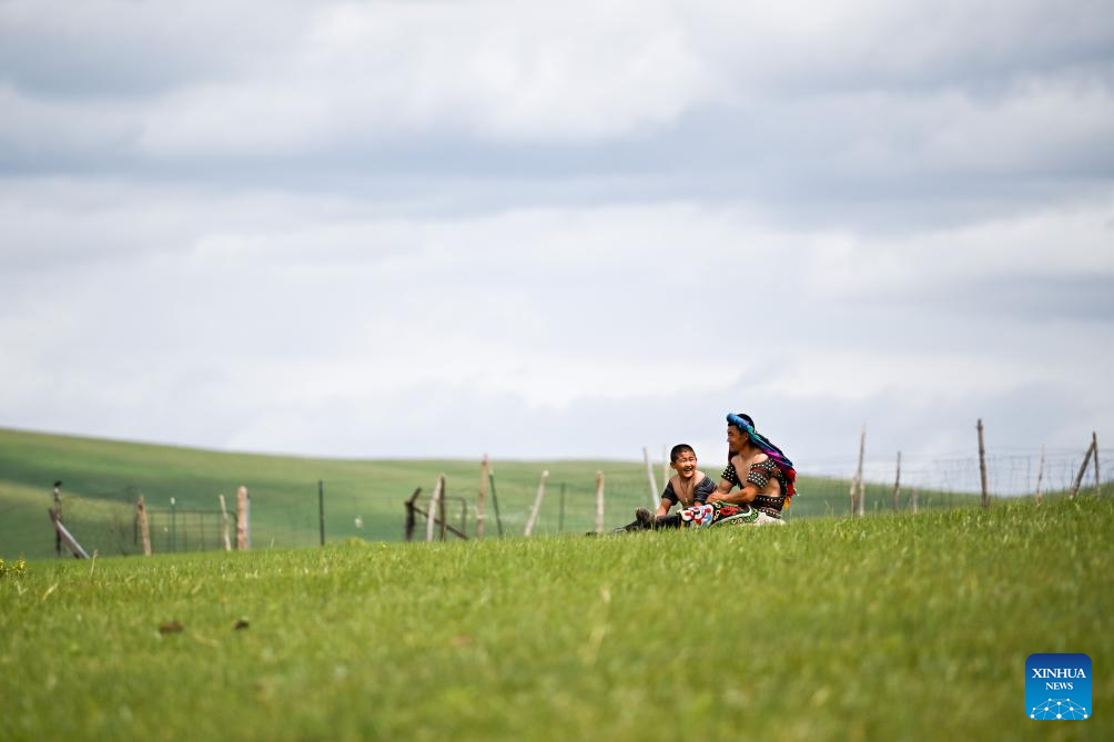 Urbuusan y su hijo Degjiin descansan después de practicar lucha mongola en un pasto en la Bandera Occidental de Ujimqin, Liga Xilingol, región autónoma de Mongolia Interior, en el norte de China, el 12 de junio de 2025. (Xinhua/Li Zhipeng.)