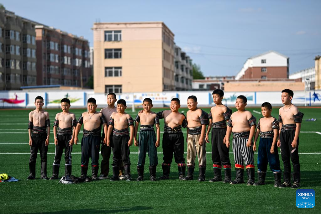 Participantes posan para una foto de grupo durante un combate de lucha mongola en la primera escuela primaria de la Bandera Occidental de Ujimqin, Liga Xilingol, región autónoma de Mongolia Interior, en el norte de China, el 12 de junio de 2025. (Xinhua/Lian Zhen.)
