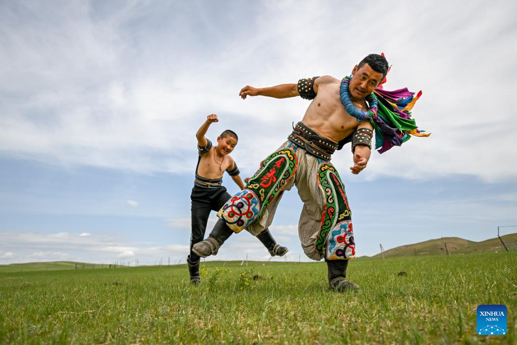 Urbuusan y su hijo Degjiin practican lucha mongola en un pasto en la Bandera Occidental de Ujimqin, Liga Xilingol, región autónoma de Mongolia Interior, en el norte de China, el 12 de junio de 2025. (Xinhua/Lian Zhen.)