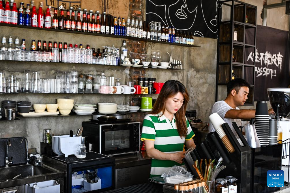 Empleados preparan bebidas en una cafetería-bar en el distrito de Wushan, municipalidad de Chongqing, suroeste de China, el 11 de junio de 2025. (Xinhua/Wang Quanchao.)