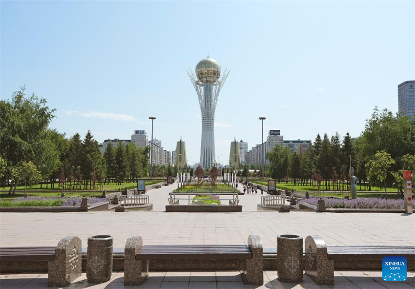Esta foto tomada el 14 de junio de 2025 muestra la Torre Baiterek en Astaná, Kazajistán. (Xinhua/Lai Xiangdong.)