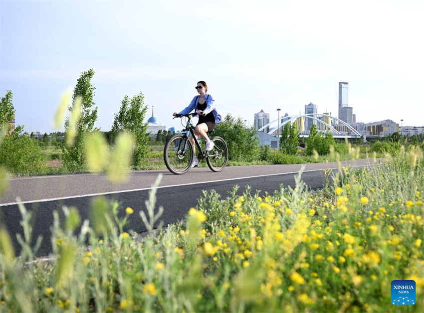 Una mujer monta en bicicleta en el Parque de Triatlón de Astaná, Kazajistán, el 11 de junio de 2025. (Xinhua/Yan Yan.)