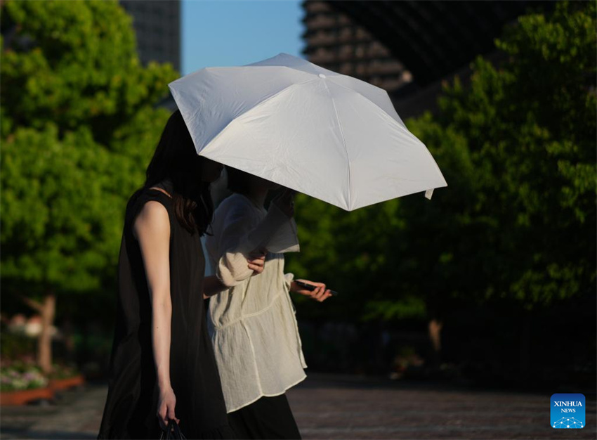 Peatonas caminan por una calle de Tokio, Japón, el 18 de junio de 2025. Tokio y otras regiones de Japón se han visto afectadas por las altas temperaturas en los últimos días. (Xinhua/Jia Haocheng.)