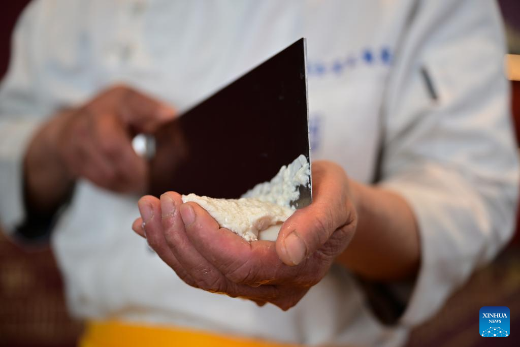 Zhang Shihong, heredero de la técnica de elaboración de banquetes de tofu, prepara «tofu en forma de crisantemo» en el distrito de Shouxian, ciudad de Huainan, provincia oriental china de Anhui, el 8 de abril de 2025. (Xinhua/Zhou Mu.)