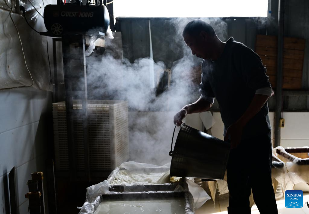 Hu Xuebing, representante del patrimonio cultural inmaterial provincial y heredero de las técnicas tradicionales de elaboración de tofu, elabora tofu en la aldea de Daquan del municipio de Bagongshan, en el distrito de Shouxian, ciudad de Huainan, provincia oriental china de Anhui, el 8 de abril de 2025. (Xinhua/Zhou Mu.)