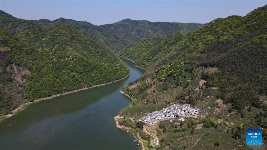 Una foto aérea tomada con un dron muestra una vista de la aldea Houkeng de Huangshan, en la provincia oriental china de Anhui, el 15 de abril de 2025. (Xinhua/Zhou Mu.)