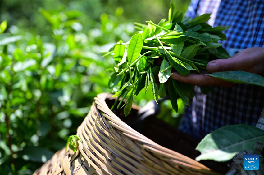 Una agricultora recoge hojas de té en la aldea de Houkeng de Huangshan, provincia oriental china de Anhui, el 15 de abril de 2025. (Xinhua/Zhou Mu.)