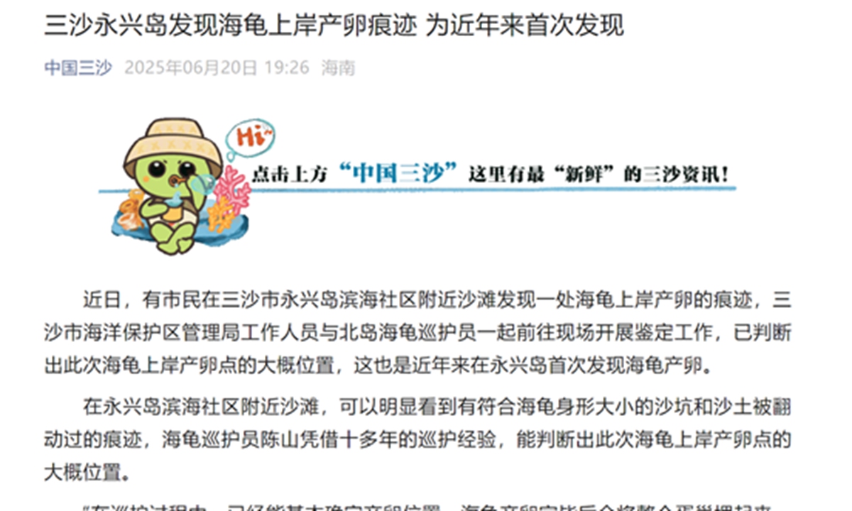 Las islas Xisha Qundao, donde se sitúa Yongxing, albergan actualmente el mayor lugar de anidación natural de tortugas verdes de China. Como especie protegida de primera clase a nivel nacional y animal emblemático de la conservación marina, las tortugas marinas cumplen un rol fundamental en el mantenimiento de la biodiversidad oceánica. Gracias a años de esfuerzos de conservación, han aumentado sus avistamientos en aguas circundantes a las islas Xisha Qundao, indicó la publicación.