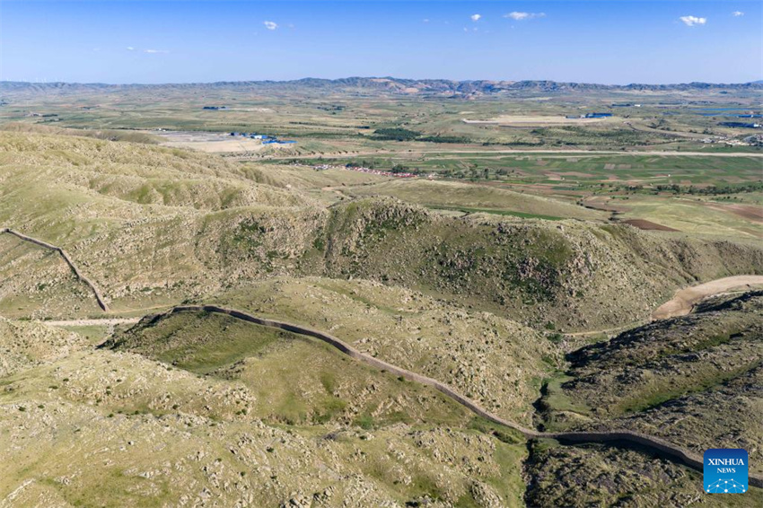 Una foto aérea tomada por un dron el 21 de junio de 2025 muestra la sección Tianshengcheng de la Gran Muralla en el distrito de Guyang, en la región autónoma de Mongolia Interior, en el norte de China. (Xinhua/Ma Jinrui.)