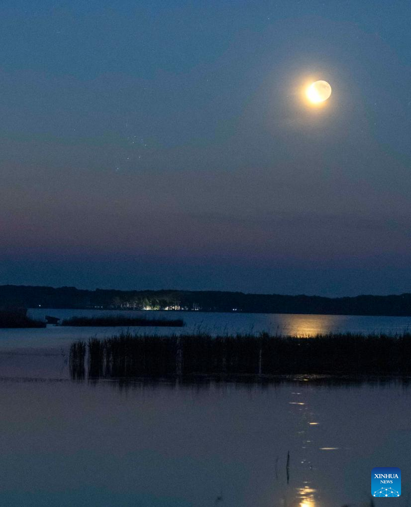 Esta foto tomada el 23 de junio de 2025 muestra una vista del cúmulo estelar de las Pléyades y una luna creciente en Qiqihar, provincia nororiental china de Heilongjiang. (Fotografía de Wang Yonggang/Xinhua.)
