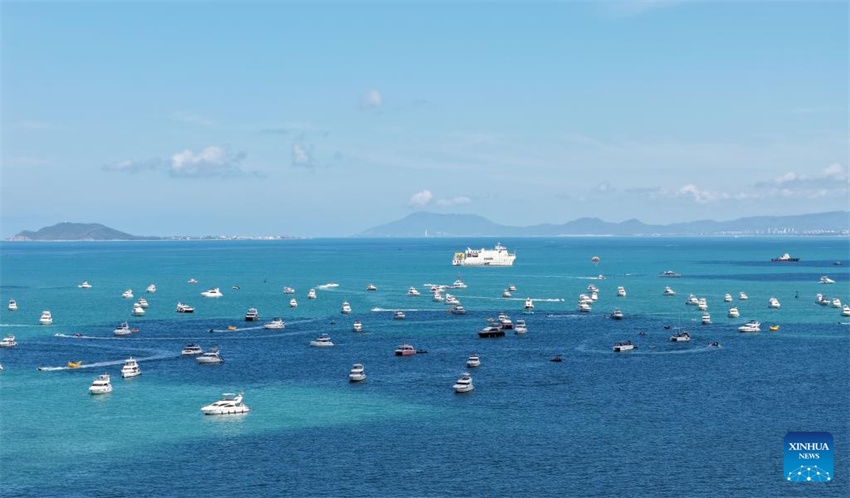 Una foto aérea tomada por un dron muestra una gran bandada de yates navegando en aguas de Sanya, provincia de Hainan, en el sur de China, el 24 de junio de 2025. A medida que se acerca la temporada alta de viajes de verano de 2025, las aguas de Sanya han reunido una gran variedad de yates, atrayendo a muchos turistas nacionales e internacionales para experimentar excursiones en yate, y disfrutar de la vibrante energía y la refrescante brisa de la ciudad costera. (Xinhua/Zhao Yingquan.)