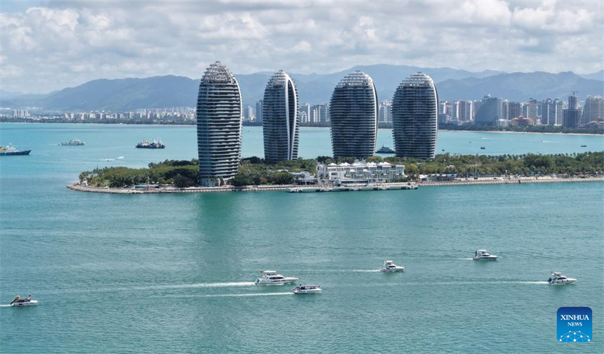 Una foto aérea tomada por un dron muestra a turistas a bordo de yates divirtiéndose en Sanya, provincia de Hainan, en el sur de China, el 24 de junio de 2025. (Xinhua/Zhao Yingquan.)