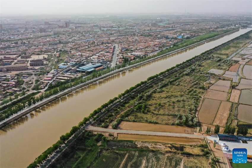 Una foto aérea tomada con dron el 28 de mayo de 2025 muestra el canal principal en el distrito de Dengkou de Bayannur, región autónoma de Mongolia Interior, en el norte de China. (Xinhua/Li Zhipeng.)