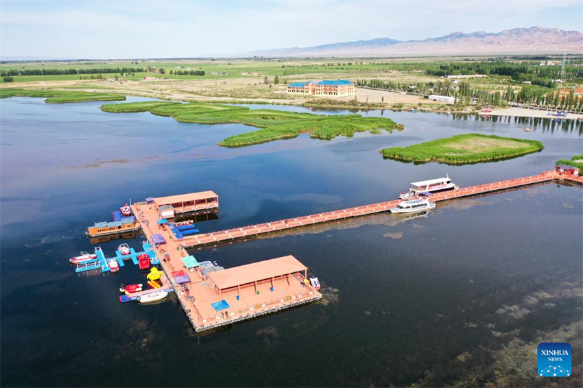 Una foto aérea tomada por un dron el 4 de junio de 2025 muestra el lago Ulansuhai Nur en Bayannur, región autónoma de Mongolia Interior, en el norte de China. (Xinhua/Li Zhipeng.)