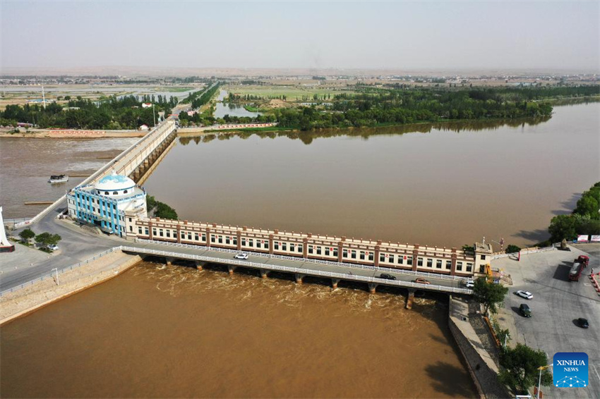 Una foto aérea tomada por un dron el 28 de mayo de 2025 muestra el Proyecto de Control del Agua de Sanshenggong en el distrito de Dengkou de Bayannur, región autónoma de Mongolia Interior, en el norte de China. (Xinhua/Li Zhipeng.)