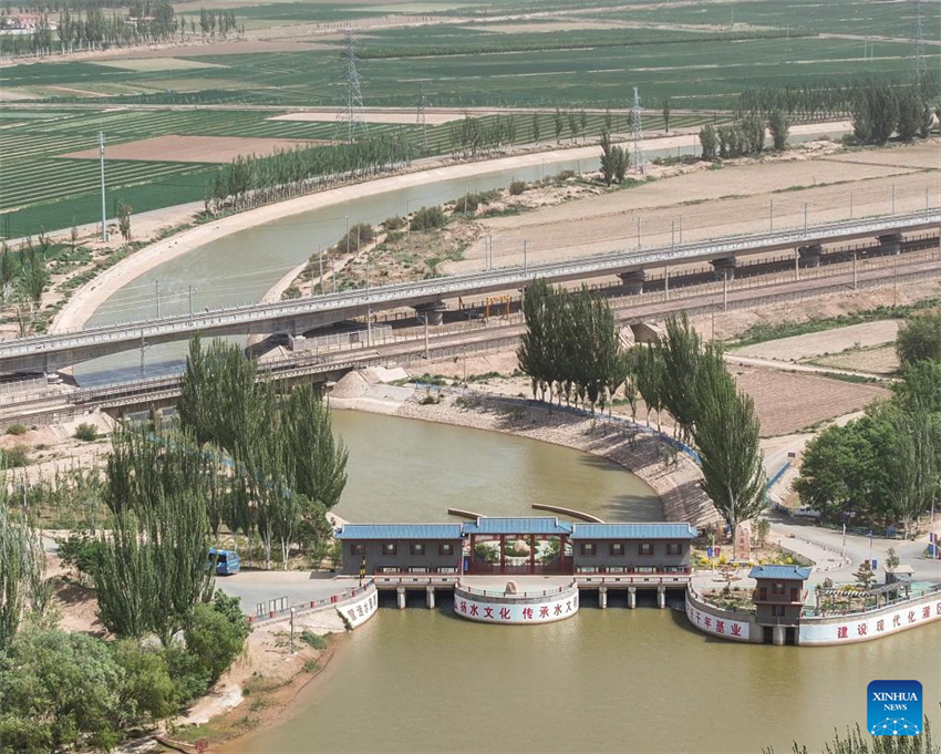 Una foto aérea tomada con un dron el 28 de mayo de 2025 muestra el segundo centro de desvío del canal principal en el distrito de Linhe de Bayannur, región autónoma de Mongolia Interior, en el norte de China. (Xinhua/Ma Jinrui.)