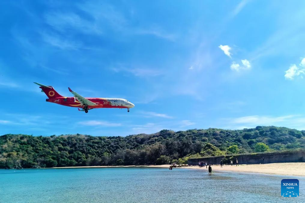 Imagen del 19 de abril de 2025 de un avión de pasajeros C909 aterrizando en el Aeropuerto de Con Dao, Vietnam. Dos aviones C909, arrendados por Chengdu Airlines a Vietjet Air de Vietnam, comenzaron a operar el 19 de abril de 2025. El sábado se cumple el noveno aniversario de la operación comercial del avión de pasajeros regional C909 desarrollado por China. Hasta la fecha, se han entregado 166 aviones C909 que han realizado más de 24 millones de viajes de pasajeros. (Xinhua)