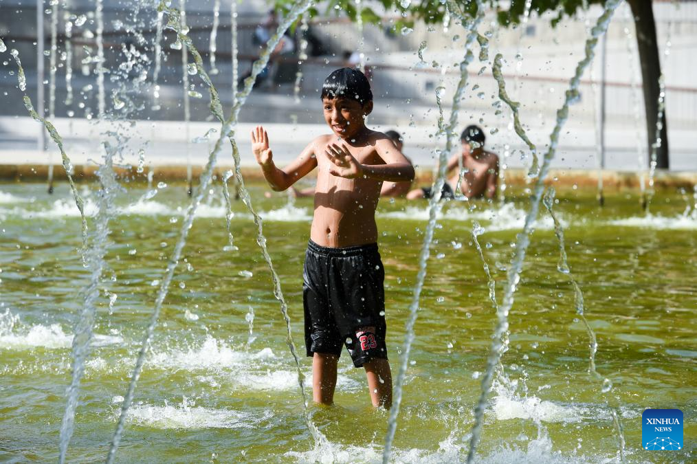 Imagen del 29 de junio de 2025 de un niño refrescándose en una fuente de un parque, en Madrid, España. España se ha visto afectada por una nueva ronda de ola de calor desde el sábado, y se espera que las temperaturas en muchas regiones superen los 40 grados centígrados en los próximos días. (Xinhua/Gustavo Valiente)