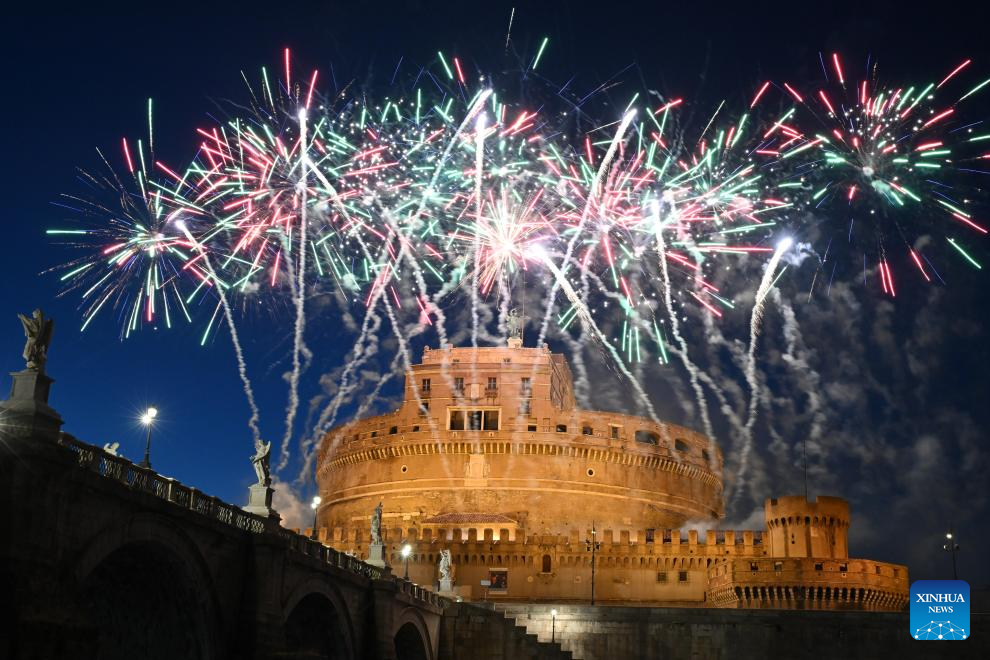 Imagen del 29 de junio de 2025 de fuegos artificiales vistos sobre el Castillo de Sant'Angelo durante un espectáculo pirotécnico, en Roma, Italia. (Xinhua/Alberto Lingria)